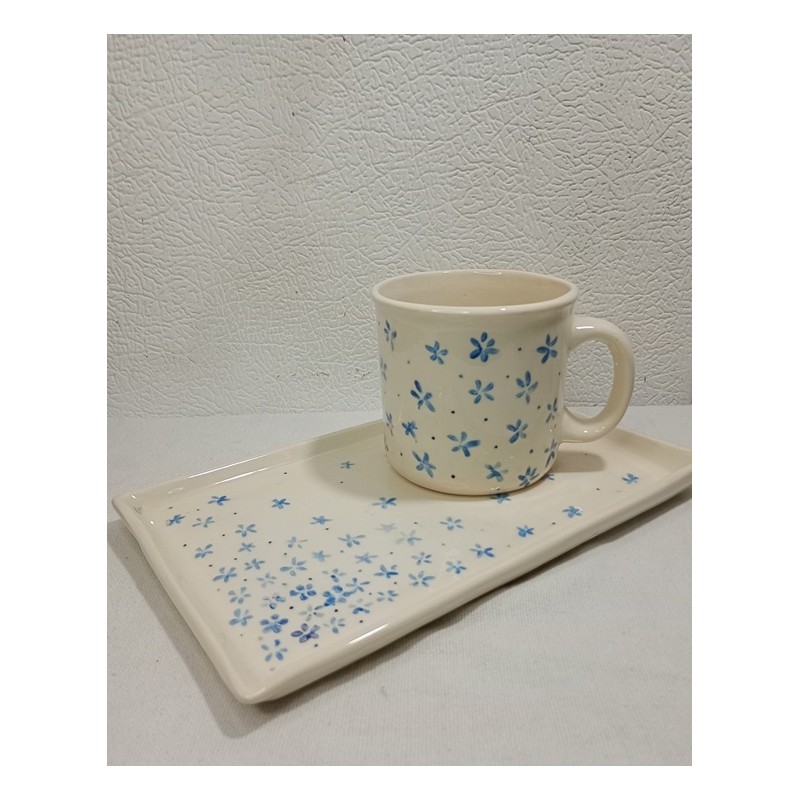 Set de bandeja mas una taza decorada con flores azules